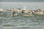 We all went down to the beach. I figured out that they were using the 4th wave for the Clydesdales too, so I didn’t feel too singled out as a newbie. I got wet, and then watched the first three waves go off. Normally I go wide right, but this time since the course turned left, I positioned myself to the left. The race starts with you on the beach, and then you charge into the water. The beach was wide enough that there was no banging. I swam well, nice and well-paced, no hurry. I was sighting very well. I held a pretty straight line. Also, because I breathe on the right, I was able to view swimmers off to my right. I had to make a few minor adjustments, but nothing too serious. I passed many people from previous waves (each wave was four minutes apart.